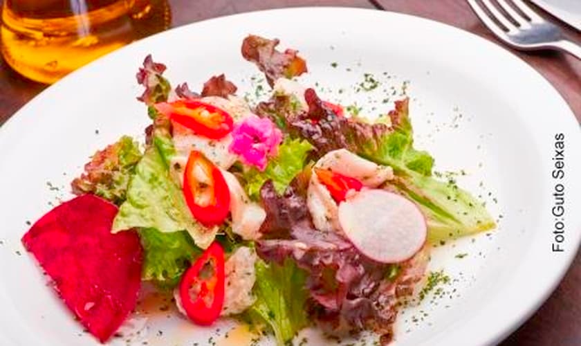- Temperar as folhas com uma parte da marinada e servir as fatias de peixe por cima das folhas, finalizando com uma pitada de flor de sal e pimenta dedo de moça fatiada.