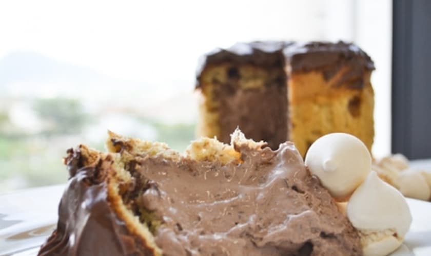 Com a ajuda de uma faca de serra, faça um buraco no panetone em formato cilíndrico, deixando uma parede de aproximadamente 1 centímetro de panetone. O pedaço de panetone que você retirou do meio, corte em cubinhos e reserve. Encha este buraco com o sorvete. Cubra o panetone com a TAMPA que você reservou e passe uma camada do creme de chocolate.