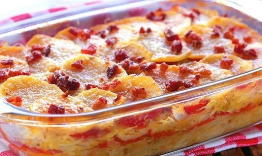 de azeite, doure a cebola, junte o repolho, o sal, a pimenta e refogue por 10 minutos. Unte um refratário com o restante do azeite, alterne camadas de batata temperadas com sal e pimenta, repolho, tomate e bacon. Despeje o caldo de legumes, polvilhe o queijo ralado e cubra