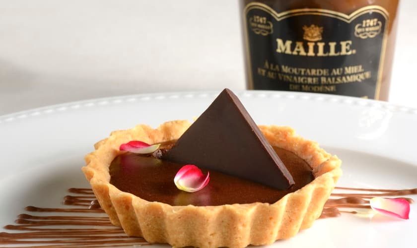 Ferva o leite com creme de leite. Bata as gemas com açúcar. Misture com um pouco de leite para temperar, coloque todas as gemas na panela como leite e cozinhe sem deixar ferver até engrossar (como creme inglês). Acrescente o chocolate picado e a gelatina hidratada em um pouco de água. Agregue a mostarda ao mel e balsâmico e recheie a base da torta. Decore com um quadradinho de chocolate.