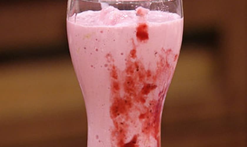 Suje as paredes de um copo alto com a calda de morango, para decorá-lo