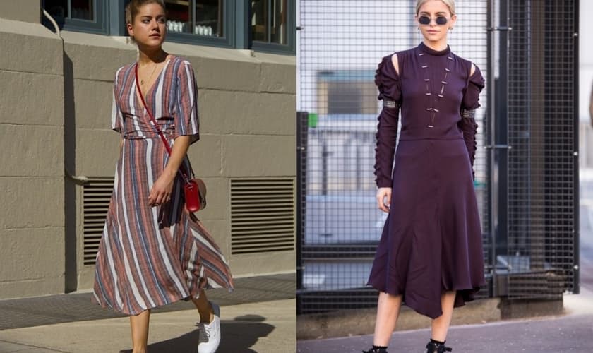 O mules é uma opção de calçado que é chique e, ao mesmo tempo, confortável. Ao combinar o vestido mídi com uma bata e uma clutch, o look fica perfeito para sair com os amigos após o expediente.
