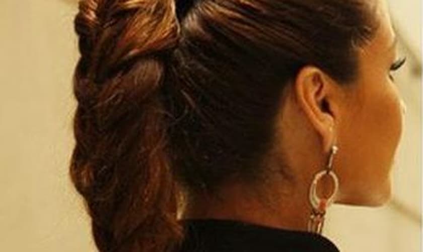 Passo 5 - Divida o rabo em duas partes. Em seguida, separe uma pequena mecha de um dos lados e junte-a à mecha grande do outro lado, e vice-versa. É importante apertar um pouco o penteado depois de cada movimento, para que o resultado fique mais firme.
