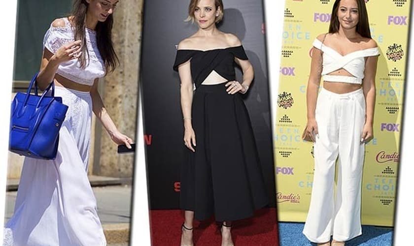 O decote ombro a ombro dá um apelo fashion aos tops cropped, sendo uma saída ideal para quem quer apostar em uma sensualidade que foge do óbvio. Combinada à uma saia longa ou com uma pantalona de cintura alta o visual fica chique e valoriza o corpo sem mostrar demais.