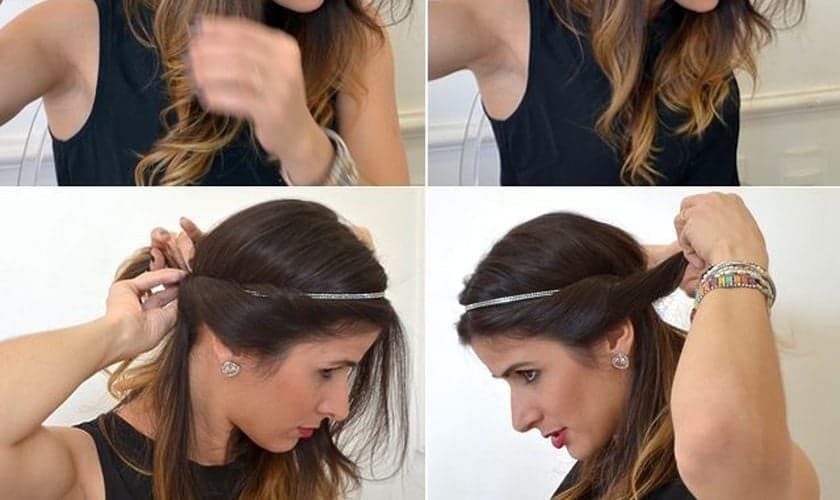 -Prenda a headband e deixe uma parte do cabelo para frente, como mostra a imagem.
