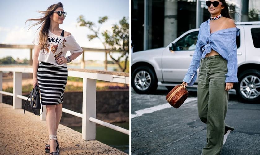 É inevitável ficar com um estilo mais descolado usando camisetas e camisas com ombros de fora. Para enfatizar ainda mais o look despojado, escolha estampas descontraídas ou peças que amarram na cintura.