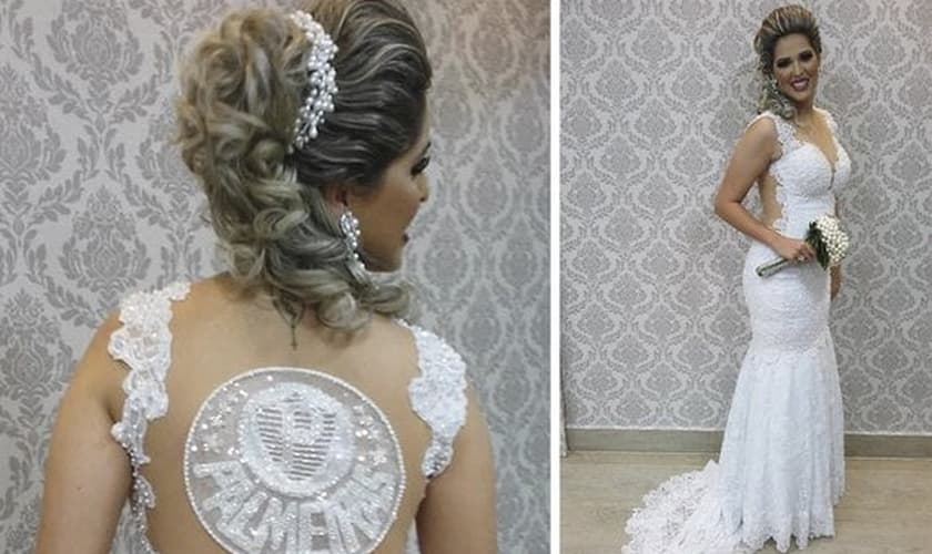 Pensando em agradar o futuro marido e ainda toda a família e a si própria, a noiva Larissa Desan de Góes, de 27 anos pediu um bordado inusitado no seu vestido: o escudo do palmeiras! Confeccionado pelo estilista, Ricardo Miller, o símbolo do time paulista nas costas ficou expressivo na vida do casal.