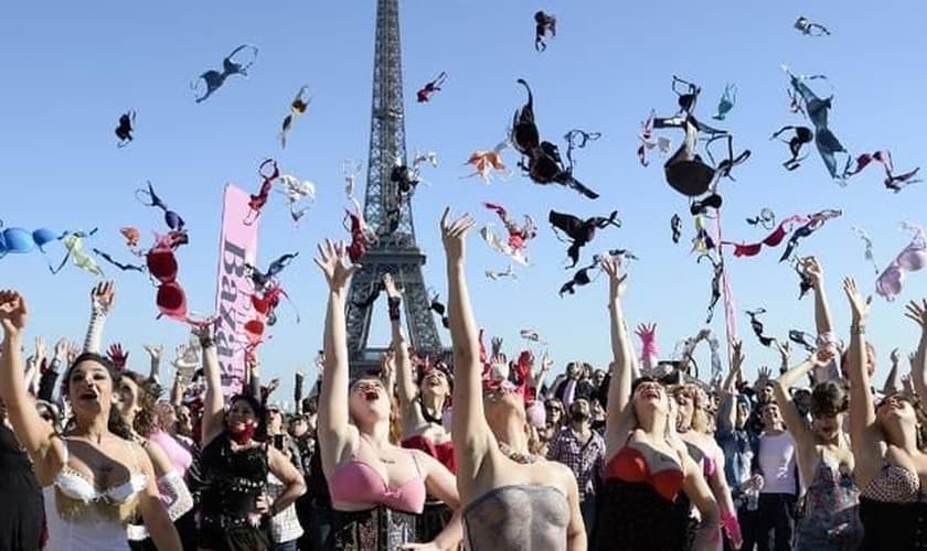 O último domingo foi marcado por protestos na capital romântica. Em Paris, mulheres se reuniram em frente a Torre Eifel, principal cartão postal, e arremessaram sutiãs para um grande ato contra o câncer de mama. Dezeas de mulheres que partiparam, acabaram dançando e atirando sutiãs para o alto.