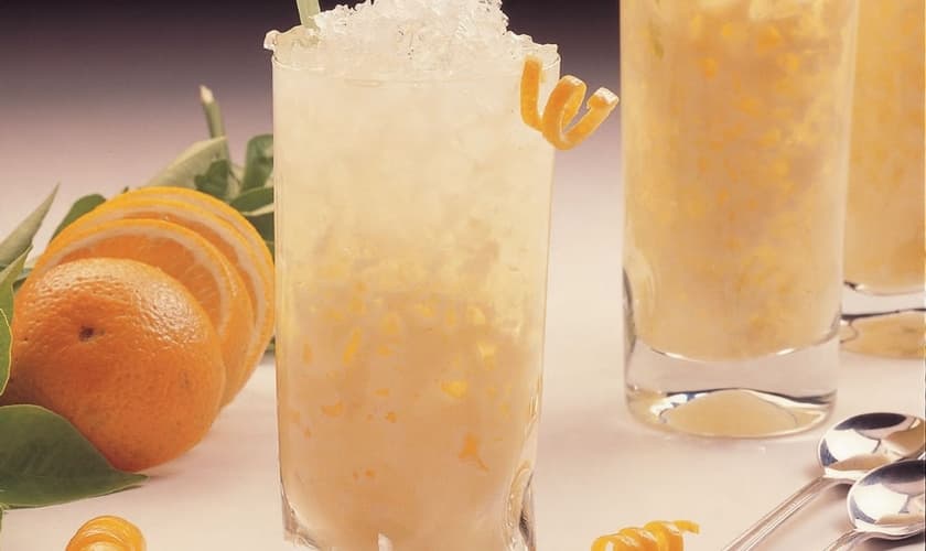 Bata no liquidificador todos os ingredientes, exceto o gelo, até que fique em consistência cremosa. Encha taçinhas com o gelo picado e por cima coloque o creme de laranja. Sirva a seguir.