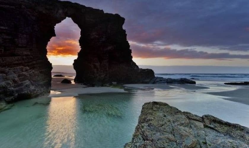 Com o nome turístico de Playa de las Catedrales, a Praia das Águas Santas fica em Ribadeo, município da costa noroeste da Espanha. A palavra “Catedrales” (Catedrais) foi integrada ao nome do lugar devido a um conjunto de formações rochosas que são esculpidas pelo vento e o mar, formando arcos que se assemelham aos das construções religiosas. Quando a maré baixa, o turista pode descer escadas até a praia e explorar as galerias de rochas e grutas formadas pela erosão hídrica.