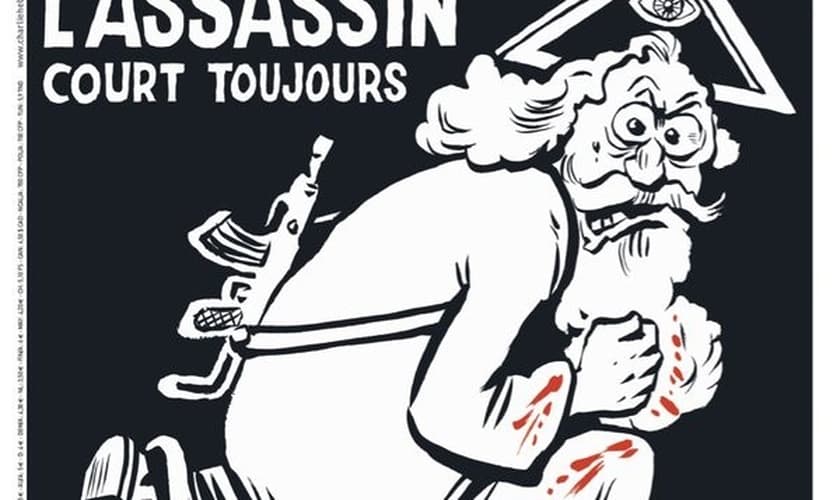 O jornal francês satírico Charlie Hebdo veio, depois de um ano do atentado terrorista que sofreu, com uma capa com “Deus” vestido de terrorista sujo de sangue e o título: O assassino continua solto.