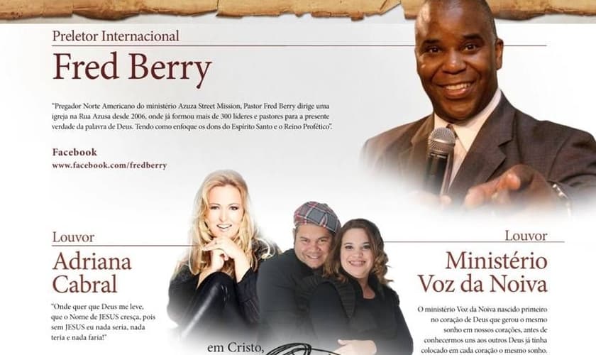 O pastor internacional Fred Berry será o preletor do evento. O louvor ficará por conta de Adriana Cabral e Ministério Voz da Noiva.