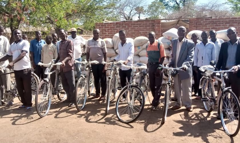 Bicicletas e alimentos foram doados para 47 pastores em Malawi. (Foto: MME)