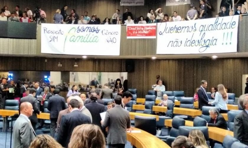 Manifestantes protestam contra a ideologia de gênero, durante votação