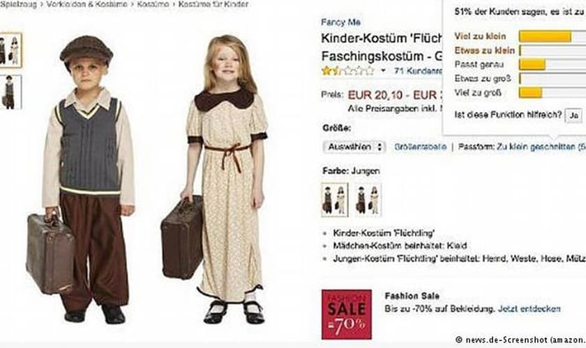 Listados na seção de "fantasias de carnaval", os trajes para meninas e meninos foram marcados como "refugiados de guerra" do período da Primeira e Segunda Guerras Mundiais.