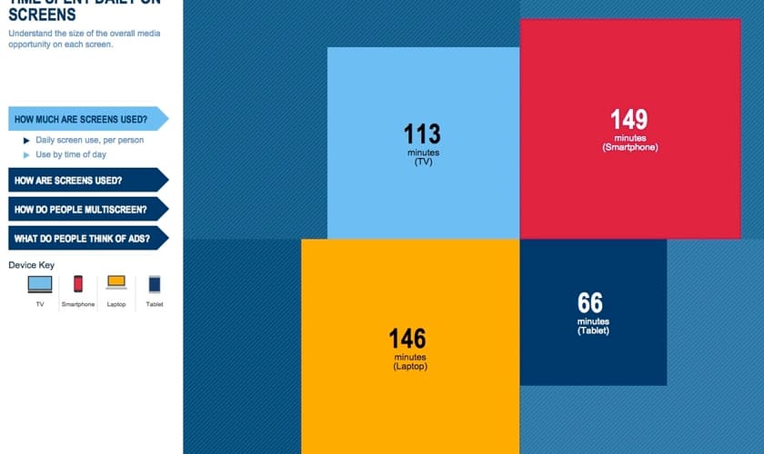 Em países como Argentina, Colômbia, Brasil e México, o consumidor multiscreen gasta em média cerca de 2,7 horas em seus smartphones e menos de uma hora em um tablet. O tempo gasto em laptops fica em segundo lugar nestes países, com o consumidor dispendendo pouco mais de duas horas por dia, em média, neste dispositivo. A televisão, considerada como um dos eletroeletrônicos mais populares da América Latina, ocupa apenas o terceiro lugar, com pouco menos de duas horas a cada dia. Em comparação com a média global, os consumidores latino-americanos permanecem 10% a mais em seus smartphones e gastam um tempo 13% maior em em seus laptops.