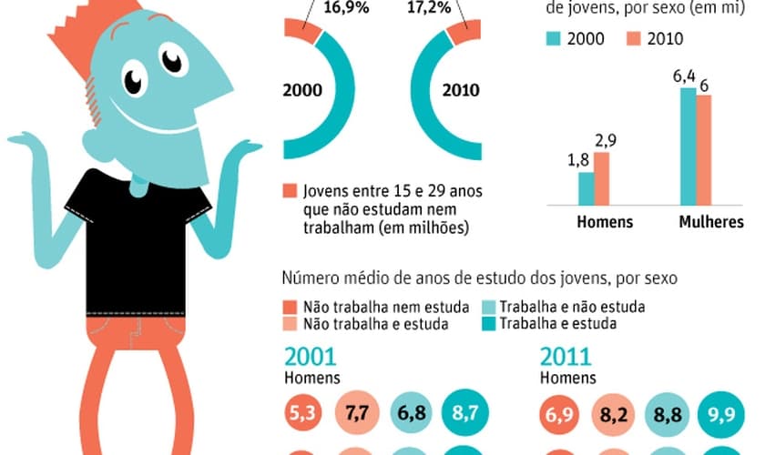 Os dados da pesquisa apontam para uma mudança no perfil desses jovens que antes era composto por um número maior de mulheres que não trabalhavam ou estudavam e são popularmente chamados de o grupo dos "nem-nem".