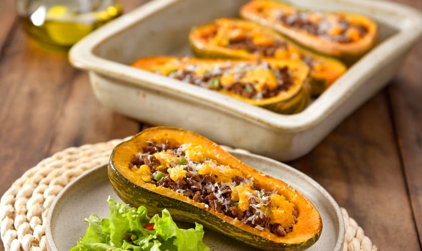 Retire as abóboras do forno e, com o auxílio de uma colher, remova a polpa, deixando uma fina camada, de cerca de 0,5 cm, junto à casca da abóbora. Espalhe o SABOR A MI® restante pela superfície interna da abóbora. Transfira a polpa da abóbora para a panela com carne moída e misture bem.