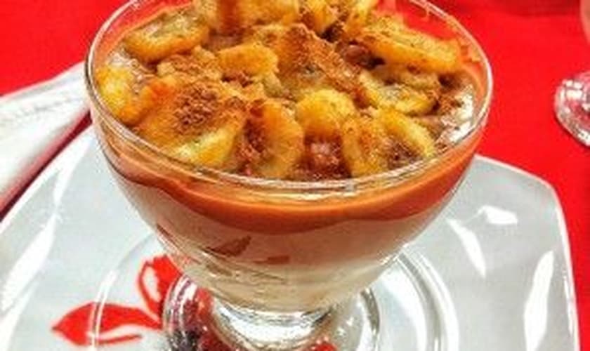 Dissolva o amido de milho em 1/2 xicara de chá de leite e despeje em uma panela com o creme de avelã e leve ao fogo. Mexendo sempre, acrescente devagar o creme de leite até engrossar. Deixe esfriar. Para o creme de baunilha, faça o mesmo processo; substituindo apenas o avelã pela baunilha. Coloque as bananas fatiadas em uma frigideira, junte o açúcar e a água até a banana ficar dourada. Em seguida, coloque o rum até flambar. Em um refratário, molhe os biscoitos com o restante do leite e monte as camadas (biscoitos, o creme de avelã, e as bananas flambadas).