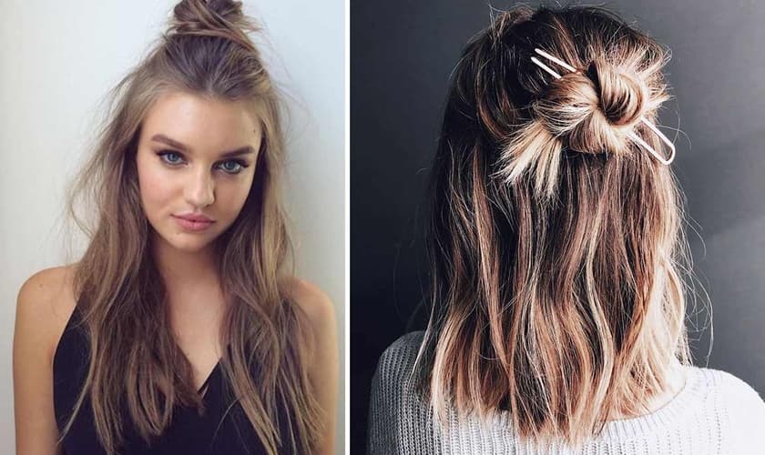 São ótimos para mudar um pouco o visual e deixar as madeixas mais interessantes sem grande esforço. O modelo com um coque feito na parte de cima combina tanto com cabelos lisos quanto com ondulados, cacheados e crespos. O coque pode ser bem esticado e polido ou mais desalinhado, no estilo messy. Para conquistar esse estilo mais bagunçadinho e despojado, utilize uma prancha para alisar desde a raiz ou modelar os cachos.