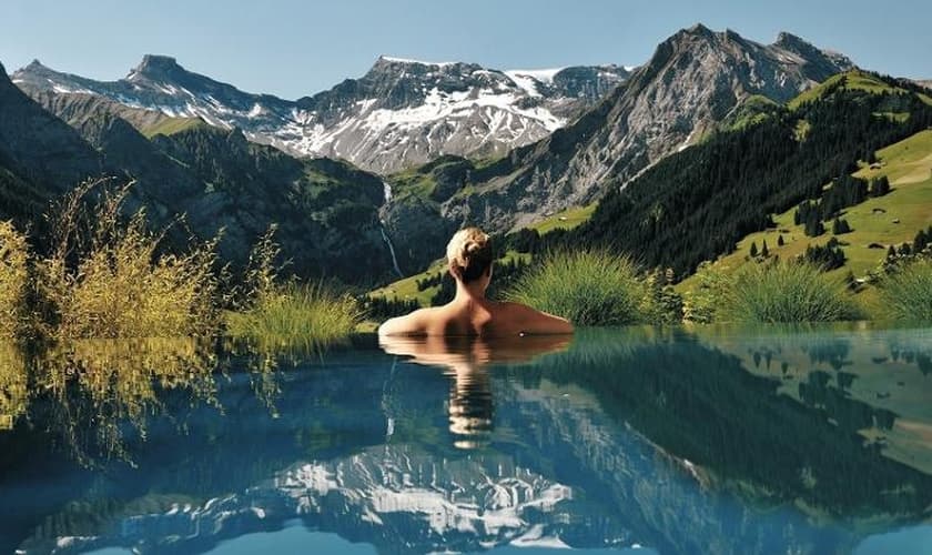 A piscina do estabelecimento permite que os hóspedes, imersos em uma água quentinha, possam observar um trecho magnífico da cordilheira alpina, recheado de montanhas recortadas em ângulos fotogênicos. No inverno, essas formações rochosas ficam quase que totalmente cobertas de neve, e, em épocas de clima mais ameno (como visto na foto), elas exibem resquícios de gelo sobre terrenos verdejantes.